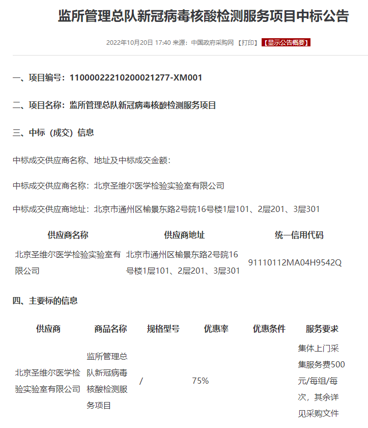中国采购网的10月20日一份采购公告也显示,低于3元的价格依然有企业愿意投标。该公告显示,北京市公安局监所管理总队新冠病毒核酸检测服务项目由北京圣维尔医学检验实验室有限公司中标。中标人在北京市医疗保障局等主管部门发布的现行价格基础上报统一折扣率,中标优惠率为75%。北京市现行价格基础,为新冠病毒核酸检测单样本检测15.2元/次、混合检测2.6元/人份。折扣率只针对检测,采样服务费按北京市医疗保障局等主管部门联合发布的现行价格执行(采样服务费0.8元/人份)。按照中标人的折扣率75%来算,中标后的混采结算价格为单人单管12.2元,多人混检2.75元。