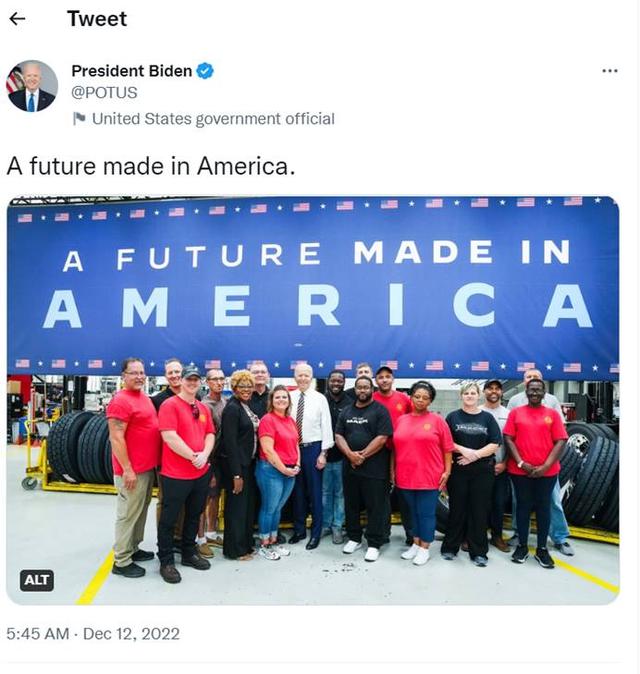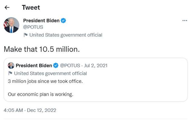 这条推文发布一小时后,拜登又转发他曾于2021年7月2日发布的有关推文称,美国已创造了“1050万个就业岗位”,而2021年时那条推文称,“自我们上任以来,已创造了300万个就业岗位。我们的经济计划正在发挥作用。”随后拜登又继续发推晒图宣传,“一个美国创造的未来。”