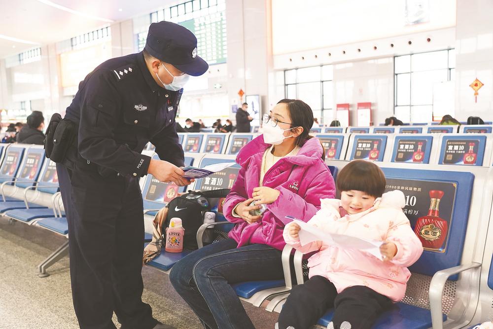 1月23日,大年初二,六安市公安局裕安分局组织民警来到六安市火车站,帮助行动不便的群众顺利进站,同时提醒大家注意保管好自身财物。 通讯员 陈星 摄