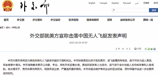 外交部就美方宣称击落中国无人飞艇发表声明(外交部网站)