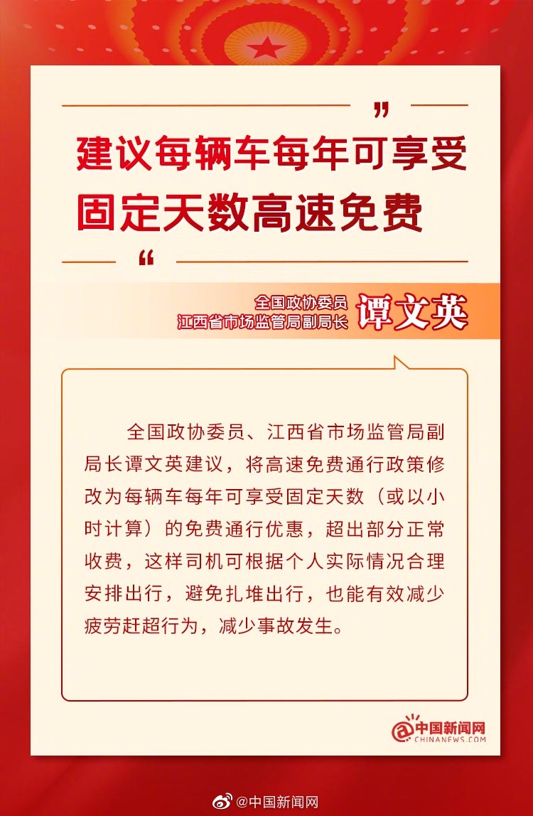 高速免费通行时间固定且集中,导致“逢免必堵”,为在免费通行时间内完成高速旅程,部分司机会疲劳驾驶、超速行驶。全国政协委员、江西省市场监管局副局长谭文英建议,将高速免费通行政策修改为每辆车每年可享受固定天数(或以小时计算)的免费通行优惠,超出部分正常收费,这样司机可根据个人实际情况合理安排出行,避免扎堆出行,也能有效减少疲劳赶超行为,减少事故发生。(记者 吴鹏泉)