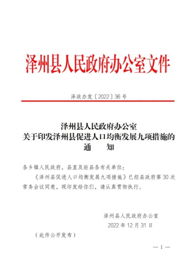 当地县政府办印发的《泽州县促进人口均衡发展九项措施》明确,对新出生且户口登记在泽州县的二(三)孩家庭分别一次性给予5000元奖励(孩次按夫妻共同生育的子女数计算)。对在泽州县落户、就业的二(三)孩家庭子女,免费享受义务教育学校放学后托管服务。中考报考县内公办高中时可加10分。