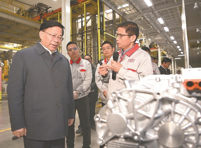 奇瑞公司是一家以汽车产业为核心的多元化企业集团,连续多年位居中国品牌乘用车出口第一。在生产车间,韩俊实地察看生产线、奇瑞汽车黑科技展品和最新车型,听取先进生产工艺、车型平台及整车架构技术、智能座舱等介绍。“乘用车热销车型有哪些”“去年出口量多少”,韩俊边听边看边问,他说,历经20多年的持续发展,奇瑞创造了奇迹。去年产值突破2000亿元,销量突破100万辆,新能源汽车销量突破20万辆,出口突破45万辆,已经站上了全新的起点。要在汽车产业大变革中勇立潮头,持续擦亮民族汽车品牌,攻克关键核心技术,坚定不移做大做强,坚定不移走出去,坚定不移抓创新、搞研发,坚定不移开放合作,不断塑造发展新优势,加快向世界一流企业迈进。韩俊强调,安徽汽车产业大有可为、前景可期,要下大气力研究、培育、壮大汽车产业,加快整车、零部件、后市场三位一体发展,进一步完善整车—核心零部件—产业链—产业集群的全链条汽车业态,大力培育在全国和全球有重要影响力的新能源汽车整车企业和关键配套企业,打造世界级的新能源汽车和智能网联汽车产业集群,推动安徽汽车产业加快迈上万亿级台阶。