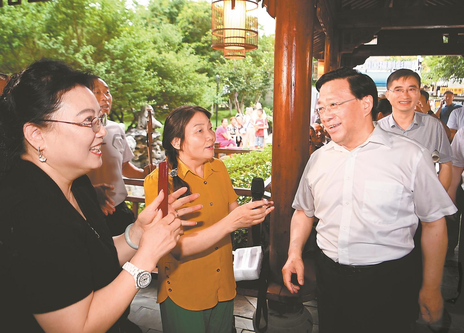 7月16日,省委书记韩俊在合肥市大蜀山半边街特色街区,调研现代服务业发展。安徽日报记者 杨 竹 摄