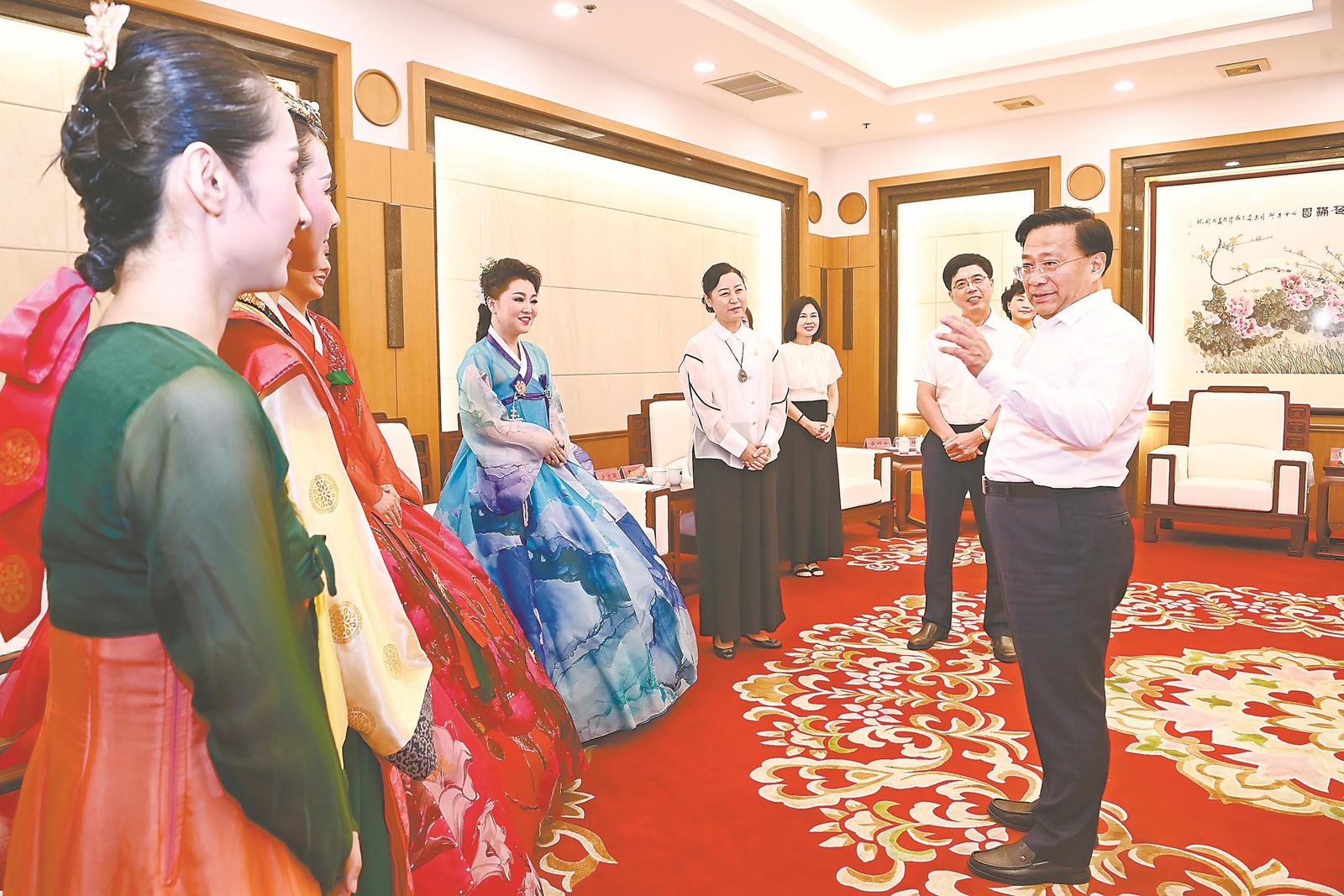 7月31日晚,由延边歌舞团演出的大型原创歌舞《同心圆梦》在安徽大剧院上演。演出结束后,省委书记韩俊与延边州有关部门负责同志和节目主创人员亲切交流,对他们来皖开展文化交流活动表示欢迎和感谢。 记者 杨 竹 摄