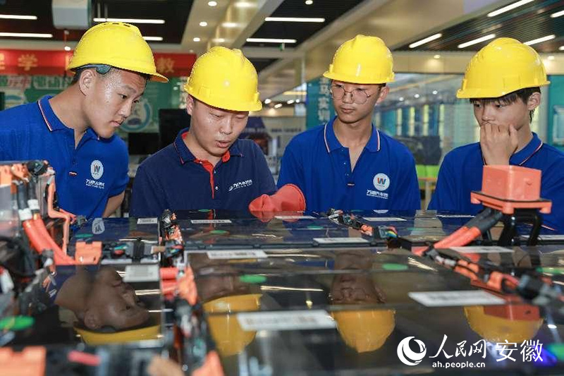 在中国东方教育集团旗下的职教院校,学生正进行拆装新能源汽车电池组实训。人民网记者 张俊摄
