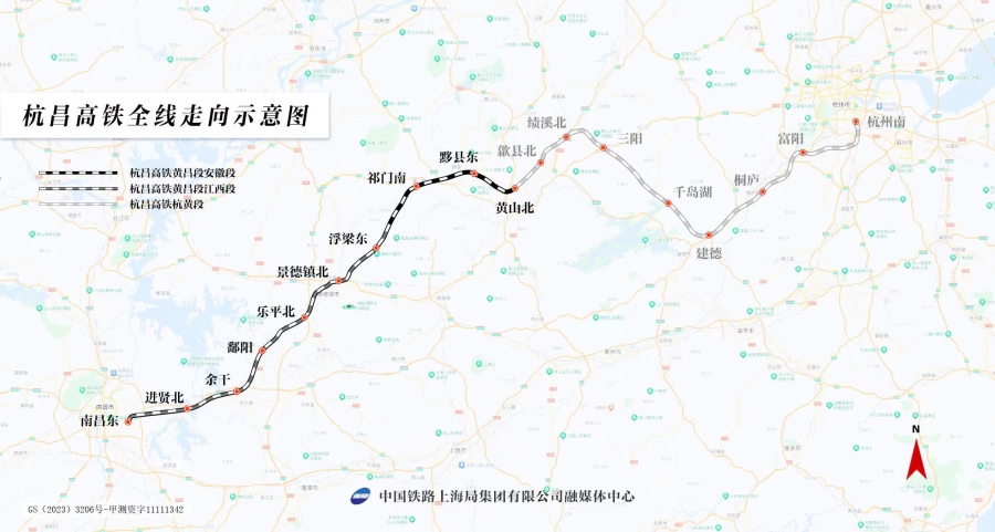 杭昌高铁起自杭州南站,途经浙江省杭州市,安徽省宣城市、黄山市,江西省景德镇市、上饶市、南昌市,接入南昌东站,线路全长560公里,其中杭昌高铁杭黄段已于2018年12月25日开通运营。本次建成通车的杭昌高铁黄昌段线路全长288公里,设计时速350公里,全线共设黄山北、黟县东、祁门南、浮梁东、景德镇北、乐平北、鄱阳、余干、进贤北、南昌东10座车站,其中黄山北、景德镇北为改扩建车站。