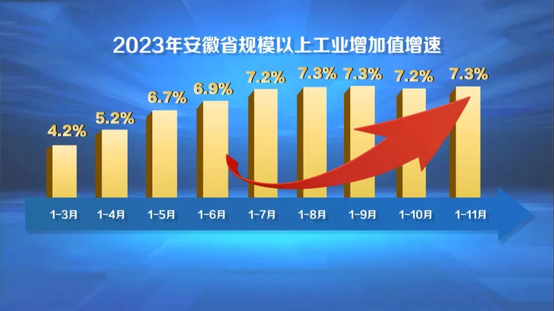 坚持把发展经济的着力点放在实体经济上,加快形成新质生产力,2023年1-11月,安徽工业投资、技改投资同比分别增长24%、22%,比全国高15个和15.7个百分点,居全国第5位和第3位;以高质量投资的“进”,促经济运行的“稳”,2023年安徽规模以上工业增加值增速逐月走高,前11个月达到7.3%,比全国高3个百分点,居全国第7位。