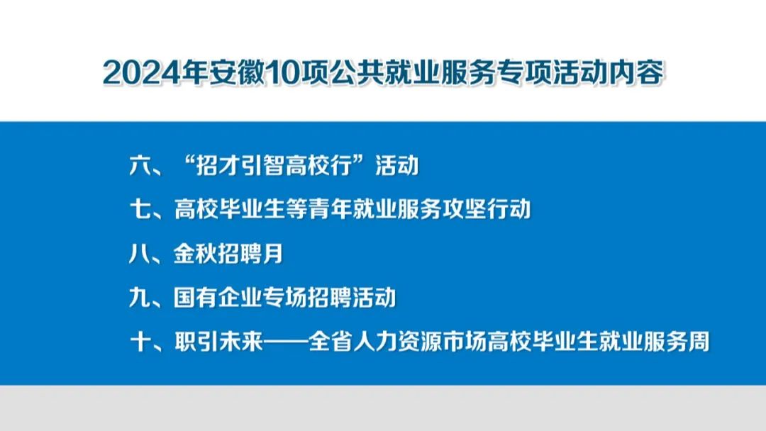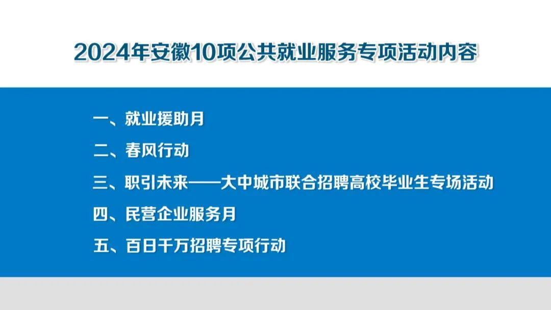 按照全国统一部署,安徽省日前开展了2024年10项公共就业服务专项活动,包括就业援助月、春风行动、民营企业服务月、招才引智高校行、百日千万招聘专项行动等。活动贯穿全年,既涉及高校毕业生、农民工、退役军人等重点群体,又涵盖就业困难人员、城镇零就业家庭等。