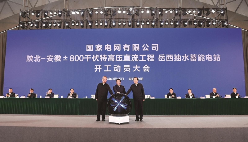 3月15日上午,国家电网有限公司陕北—安徽±800千伏特高压直流输电工程和岳西抽水蓄能电站开工动员大会,在安徽、陕西两地以视频连线形式同步举行。在安徽主会场,省委书记韩俊、省长王清宪、国家电网有限公司董事长辛保安共同按下按钮,启动项目开工建设。