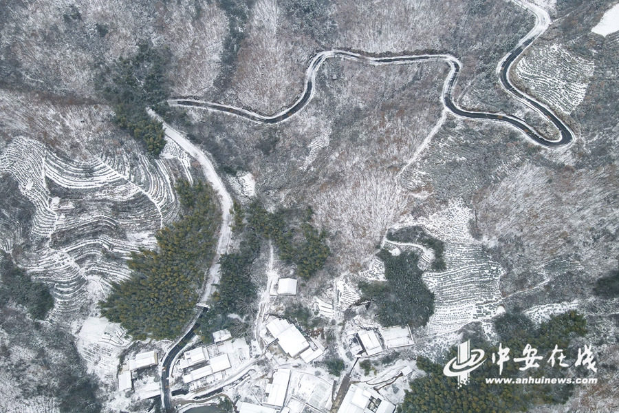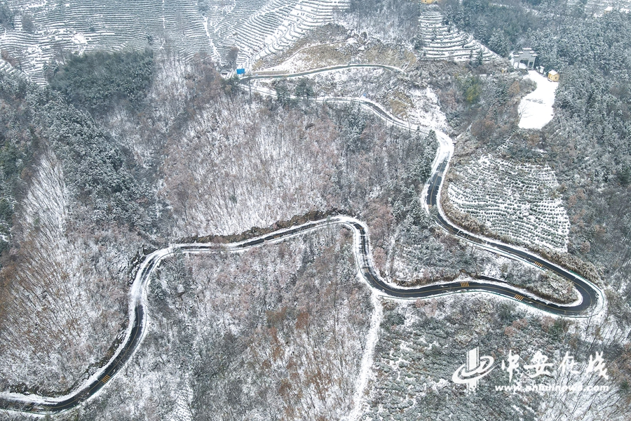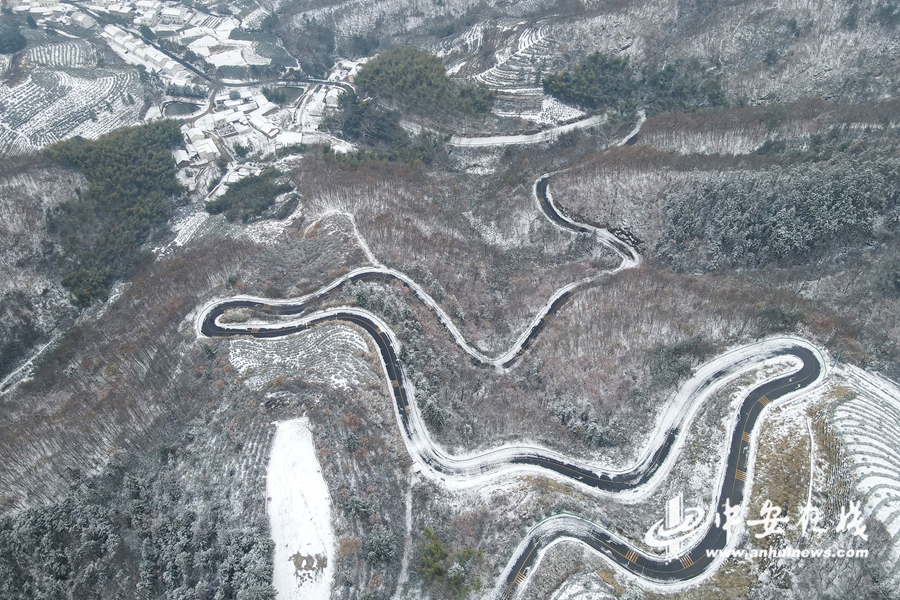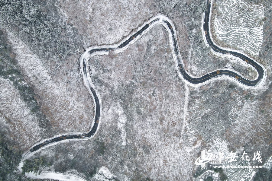 中安在线、中安新闻客户端讯 2023年12月19日,航拍安徽省合肥市庐江县汤池镇入冬雪后大地银装素裹,二姑尖盘山公路蜿蜒曲折,宛如“山舞银蛇”水墨画一般,美不胜收。