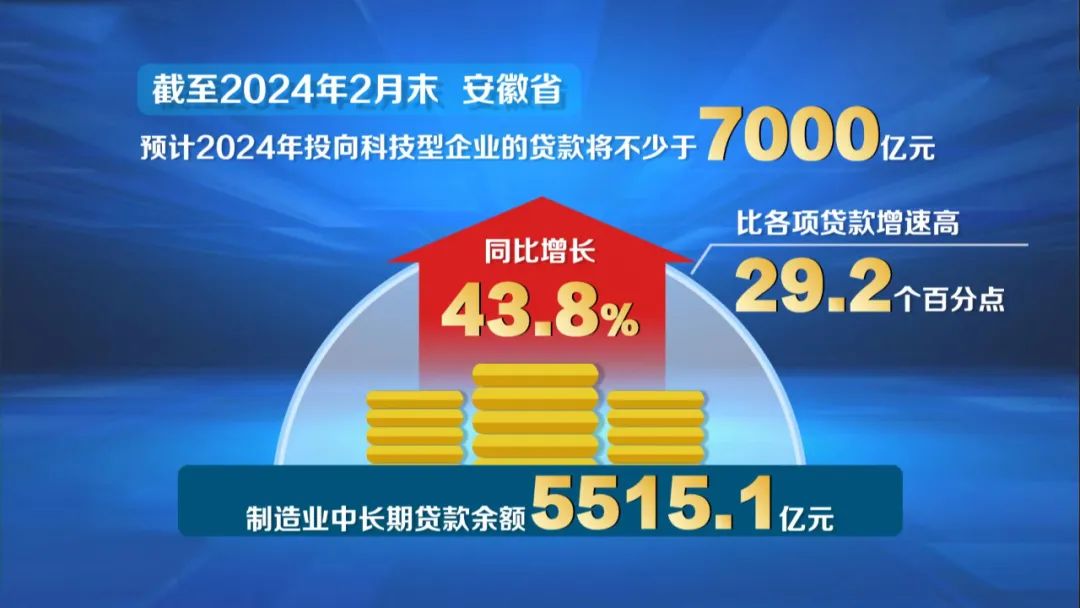 围绕重大战略、重点领域和薄弱环节,着力提升金融服务实体经济质效,截至2月末,安徽省制造业中长期贷款余额为5515.1亿元,同比增长43.8%,比各项贷款增速高29.2个百分点;预计今年全年投向科技型企业的贷款将不少于7000亿元。