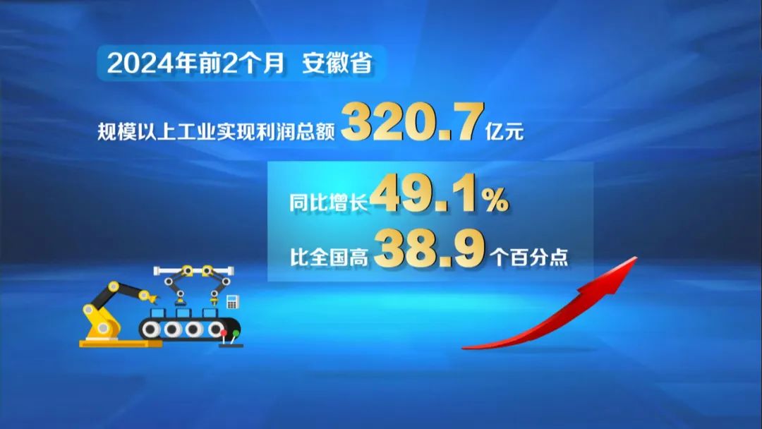 金融赋能高质量发展,今年前2个月,安徽规模以上工业增加值同比增长8.3%,比全国高1.3个百分点,比上年同期高3.2个百分点;实现利润总额320.7亿元,同比增长49.1%,比全国高38.9个百分点。