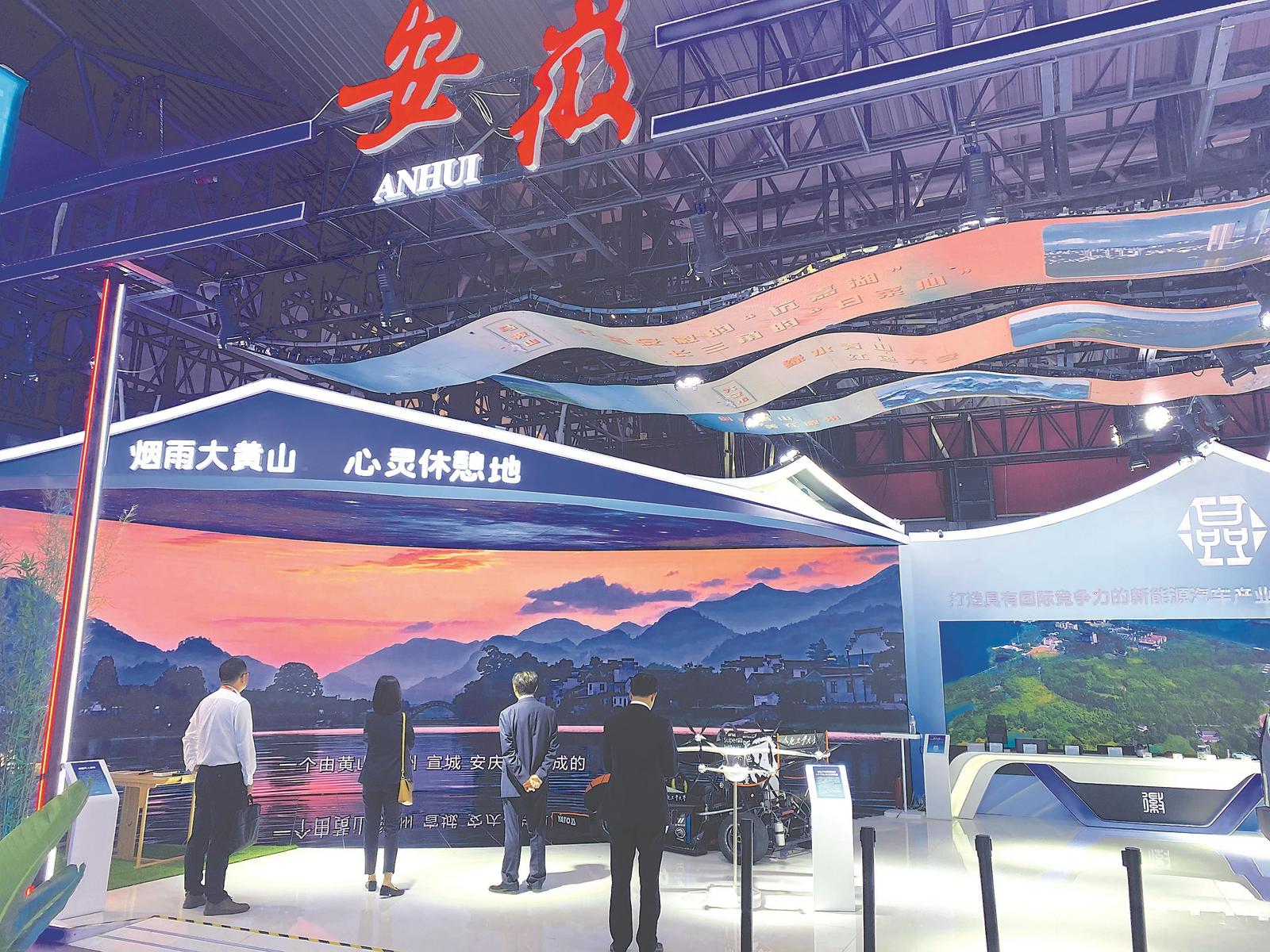 安徽馆以“皖美十年 品铸江淮”为主题,重点展示汽车首位产业和大黄山世界级休闲度假康养旅游目的地品牌建设成果。展馆突出一体化展示、沉浸式体验,通过“乘坐赛车游览大黄山美景”的形式,将汽车和大黄山两大主题巧妙衔接,实现汽车“硬科技”与大黄山“软文化”的跨界融合。