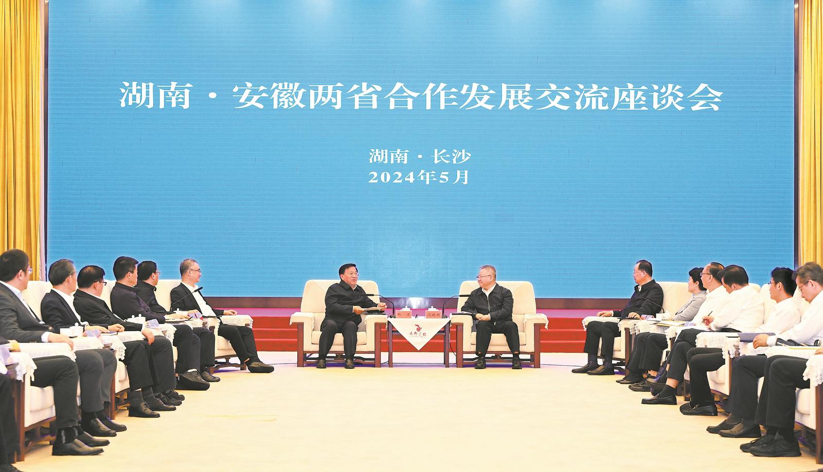 沈晓明代表湖南省委、省政府对安徽省党政代表团一行表示欢迎,对安徽省长期以来给予湖南工作的大力支持表示感谢。他说,习近平总书记在去年10月召开的进一步推动长江经济带高质量发展座谈会和今年3月召开的新时代推动中部地区崛起座谈会上提出了一系列明确要求。湖南和安徽同为中部地区重要省份和长江经济带发展重要成员,贯彻落实好习近平总书记重要讲话精神,既是两省共同的政治责任,也为双方深化合作提供了广阔空间。实践证明,只要我们按照习近平总书记指引的方向前进,充分发挥各自在区位交通、产业结构、资源禀赋等方面的优势,精诚合作、互助互惠,不仅能为各自发展集聚新动能,还能为促进全国区域协调发展大局贡献力量。今年4月,湖南省党政代表团到安徽学习考察,实地感受了近年来安徽取得的发展成就和党员干部的优良作风,并同安徽在重大战略对接、产业协作互补、科技协同创新、文化繁荣发展等方面达成了很多重要共识。希望双方进一步加强沟通对接,携手推动既定合作事项加快落地见效,健全完善联席会议、定期互访等常态化交流合作机制,深化拓展交流合作领域、延伸交流合作层次,推动各领域交流合作常态化、制度化、具体化,不断开创湘皖合作共赢新局面。(通讯员 郑言)