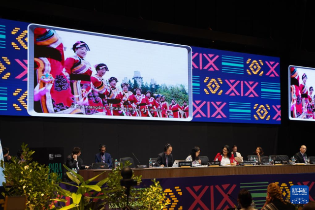 12月5日,在巴拉圭亚松森联合国教科文组织保护非物质文化遗产政府间委员会第19届常会评审现场,大屏幕播放“羌年”宣传视频。