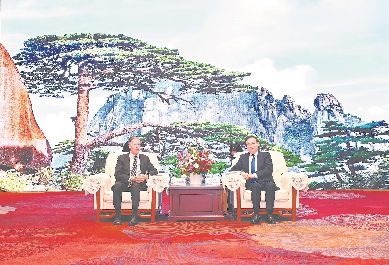 梁言顺代表省委、省政府对尼古拉斯·伯恩斯一行表示欢迎,并简要介绍安徽经济社会发展情况。他说,今年11月,习近平主席同拜登总统时隔一年再次会晤,为中美关系发展指明了方向。我们愿同美方一道,认真落实两国元首达成的重要共识和成果,加强经贸、人文等领域合作,为推动中美关系稳定、健康、可持续发展发挥积极作用。