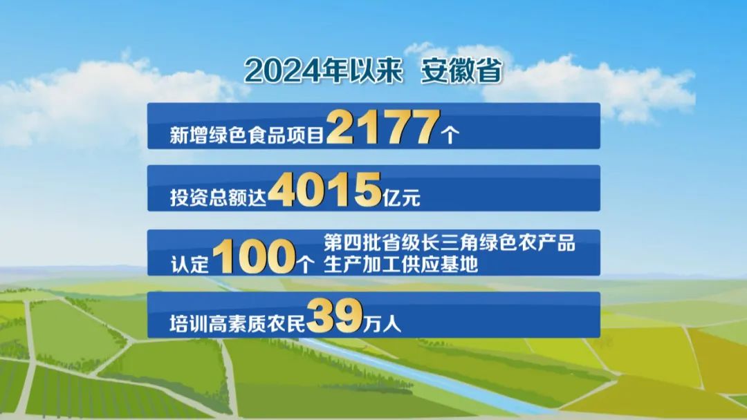 牢记总书记嘱托,目前,安徽在组建10大绿色食品产业专班基础上,加快推进产业链、创新链、资金链、人才链深度融合,今年以来,新增绿色食品项目2177个,投资总额达4015亿元,认定100个第四批省级长三角绿色农产品生产加工供应基地,培训高素质农民39万人,让广大农民得到可感可及的实惠,加快建设高质高效农业强省。