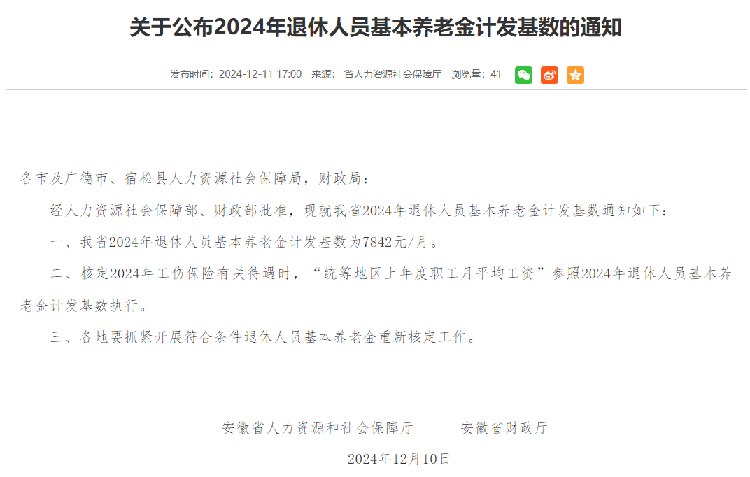 日前, 安徽省人力资源和社会保障厅、安徽省财政厅联合发布《关于公布2024年退休人员基本养老金计发基数的通知》。通知具体内容如下:
