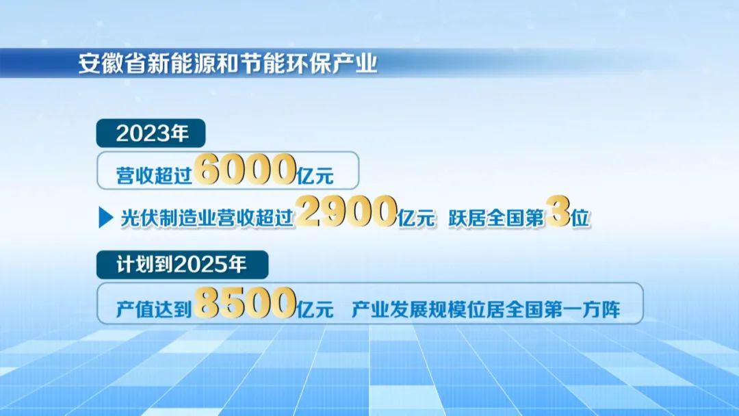 蓄势新能源,激发新动能。当前,安徽省聚焦新能源、高效节能等五大板块,形成了光伏、先进环保、资源循环利用等产业集群。2023年,安徽新能源和节能环保产业营收超过6000亿元,其中光伏制造业营收超过2900亿元,跃居全国第3位;计划到2025年,全省新能源和节能环保产业产值达到8500亿元,产业发展规模位居全国第一方阵。