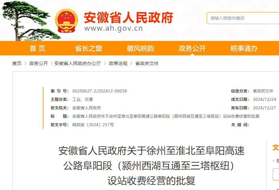 《关于徐州至淮北至阜阳高速公路阜阳段(颍州西湖互通至三塔枢纽)设站收费经营的请示》(皖交路〔2024〕172号)悉。经研究,现批复如下: