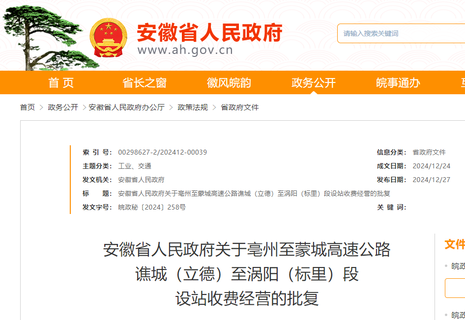 《关于亳州至蒙城高速公路谯城(立德)至涡阳(标里)段设站收费经营的请示》(皖交路〔2024〕173号)悉。经研究,现批复如下: