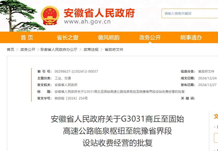 《关于G3031商丘至固始(原S16合肥至周口)高速公路临泉枢纽至皖豫省界段设站收费的请示》(皖交路〔2024〕174号)悉。经研究,现批复如下: