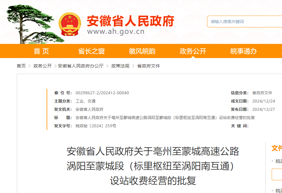 《关于亳州至蒙城高速公路涡阳至蒙城段(标里枢纽至涡阳南互通)设站收费的请示》(皖交路〔2024〕175号)悉。经研究,现批复如下: