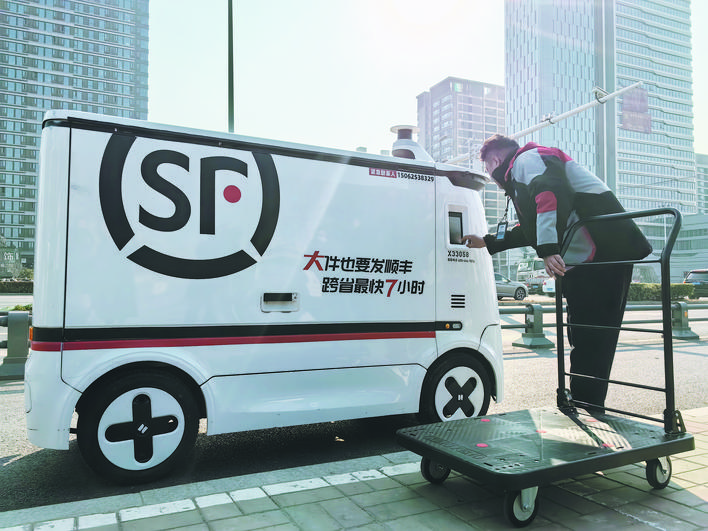 顺丰快递员许家伟早已等候在此,只见他熟练地将两大件快递包裹从无人运输车上卸下后,快速从垂梯下到站厅,通过安检后再从垂梯直达站台列车首部位置。