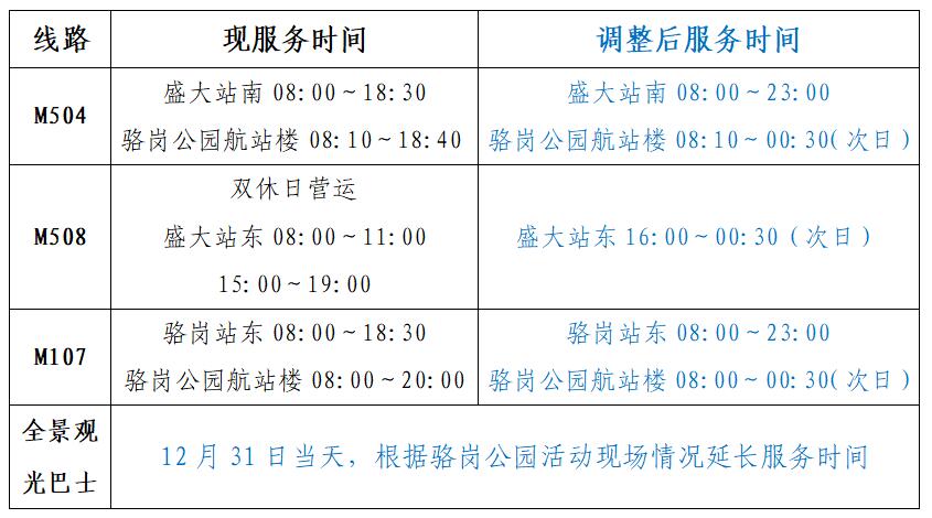 M504、M508、M107、骆岗公园全景观光巴士等4条线路服务时间