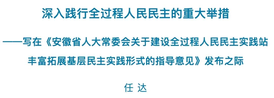 党的十八大以来,习近平总书记原创性提出全过程人民民主重大理念,具有划时代意义。党的二十大就发展全过程人民民主、保障人民当家作主作出全面部署,党的二十届三中全会就“健全全过程人民民主制度体系”“丰富各层级民主形式”作出重要安排,省委十一届七次全会要求探索推广全过程人民民主基层实践形式。2021年中央人大工作会议召开后,我省合肥、安庆、滁州等市创新践行全过程人民民主基层实践形式,展现出基层探索的蓬勃生命力,积累了一定的工作基础和实践经验。新年伊始,安徽省人大常委会发布一号文件《关于建设全过程人民民主实践站丰富拓展基层民主实践形式的指导意见》,这是贯彻中央决策部署,落实省委工作要求,鼓励基层探索创新,发展更加广泛、更加充分、更加健全的全过程人民民主的重大举措,对于保障人民群众依法管理国家事务、管理经济和文化事业、管理社会事务,具有十分重要的意义。