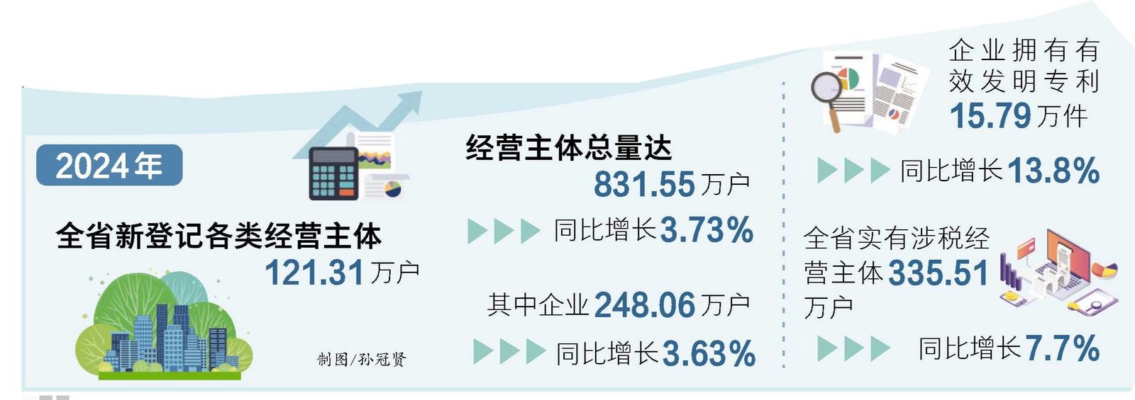 安徽经营主体结构进一步优化、质量进一步提升。日前,记者从省市场监管局获悉,2024年,全省新登记各类经营主体121.31万户,经营主体总量达831.55万户、同比增长3.73%。其中,企业248.06万户,同比增长3.63%。企业拥有有效发明专利15.79万件,同比增长13.8%。全省实有涉税经营主体335.51万户,同比增长7.7%。