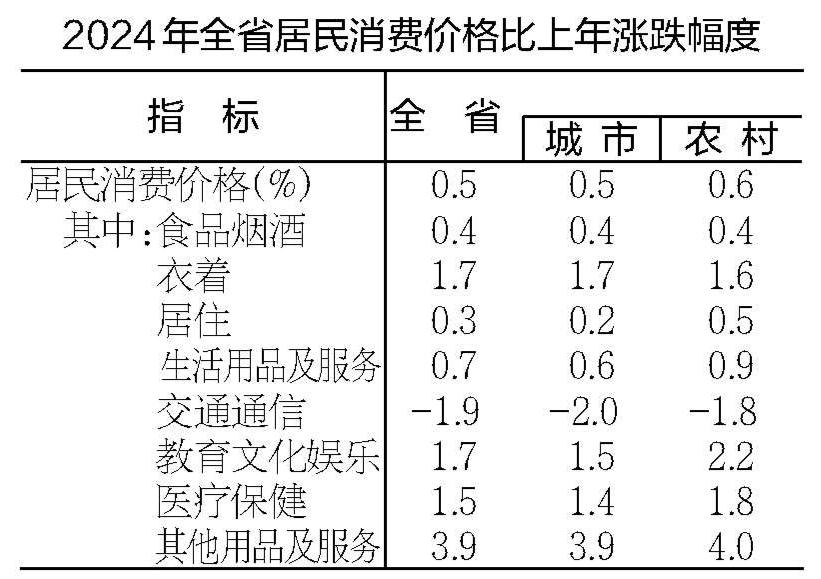 全年居民消费价格比上年上涨0.5%,其中食品烟酒价格上涨0.4%。工业生产者出厂价格下降2.8%。工业生产者购进价格下降2.8%。农产品生产价格下降1.3%。