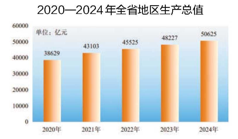 初步核算,全年全省地区生产总值[2]50625亿元,比上年增长5.8%。其中,第一产业增加值3566亿元,增长3.2%;第二产业增加值19607亿元,增长7.4%;第三产业[3]增加值27452亿元,增长4.9%。工业增加值14171亿元,增长8.2%。三次产业结构由上年的7.3∶38.8∶53.9调整为7.0∶38.7∶54.3。人均地区生产总值82694元(折合11612美元),比上年增长5.8%。全员劳动生产率[4]为158203元/人,比上年增加7069元/人。