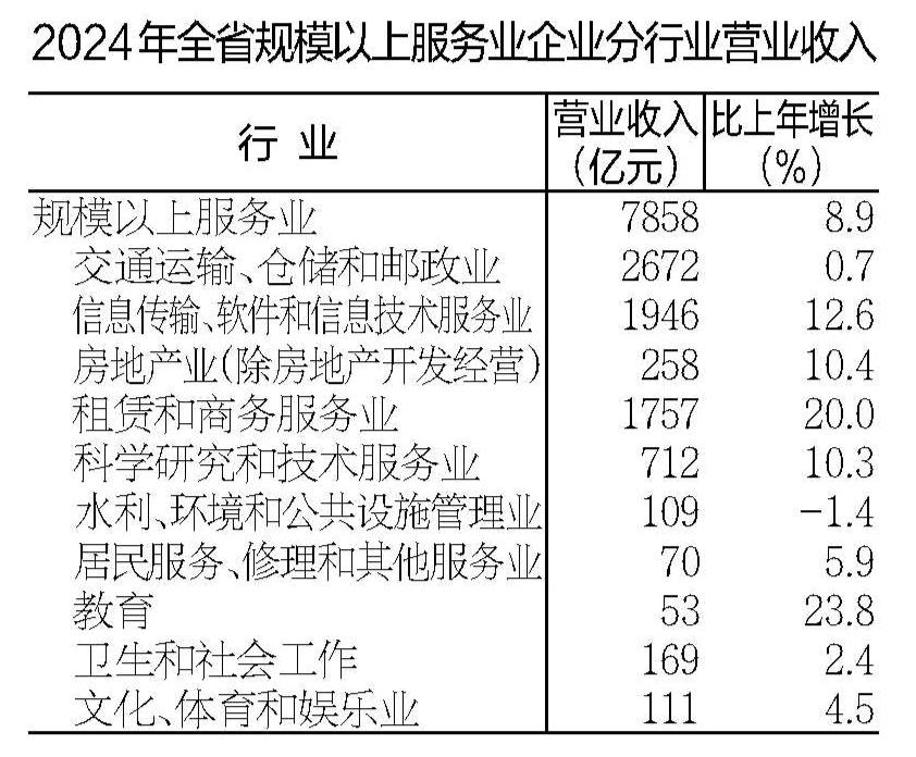 全年规模以上服务业企业营业收入7858亿元,比上年增长8.9%;利润438亿元,增长4.8%。
