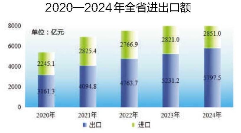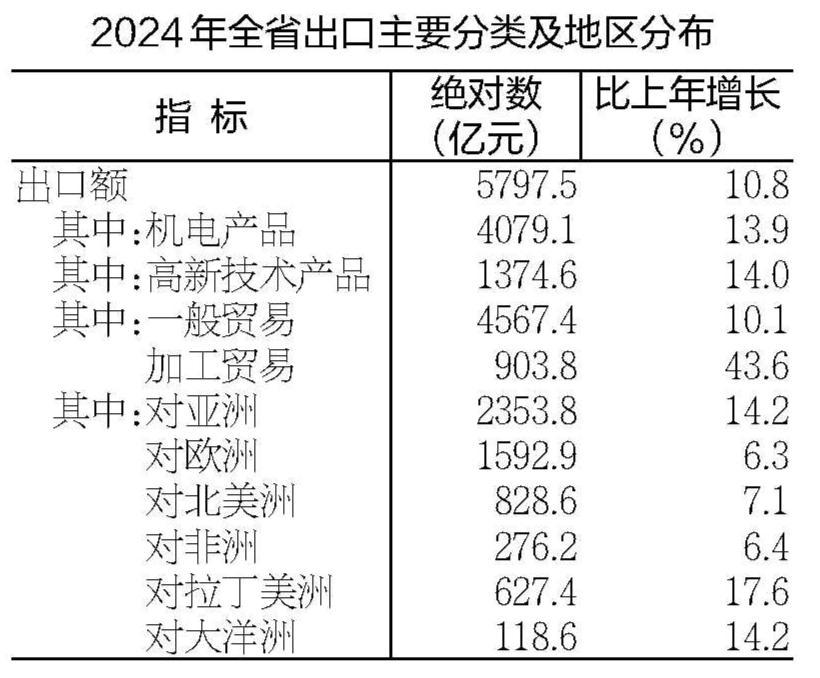全年货物进出口总额8648.5亿元,比上年增长7.4%。其中,出口5797.5亿元,增长10.8%;进口2851.0亿元,增长1.0%。从出口商品看,机电产品出口增长13.9%,高新技术产品出口增长14.0%。电动汽车、锂离子蓄电池、光伏产品“新三样”合计出口490.1亿元,增长23.6%。对共建“一带一路”国家进出口4632.6亿元,增长6.3%。其中,出口3063.0亿元,增长11.0%;进口1569.6亿元,下降1.7%。