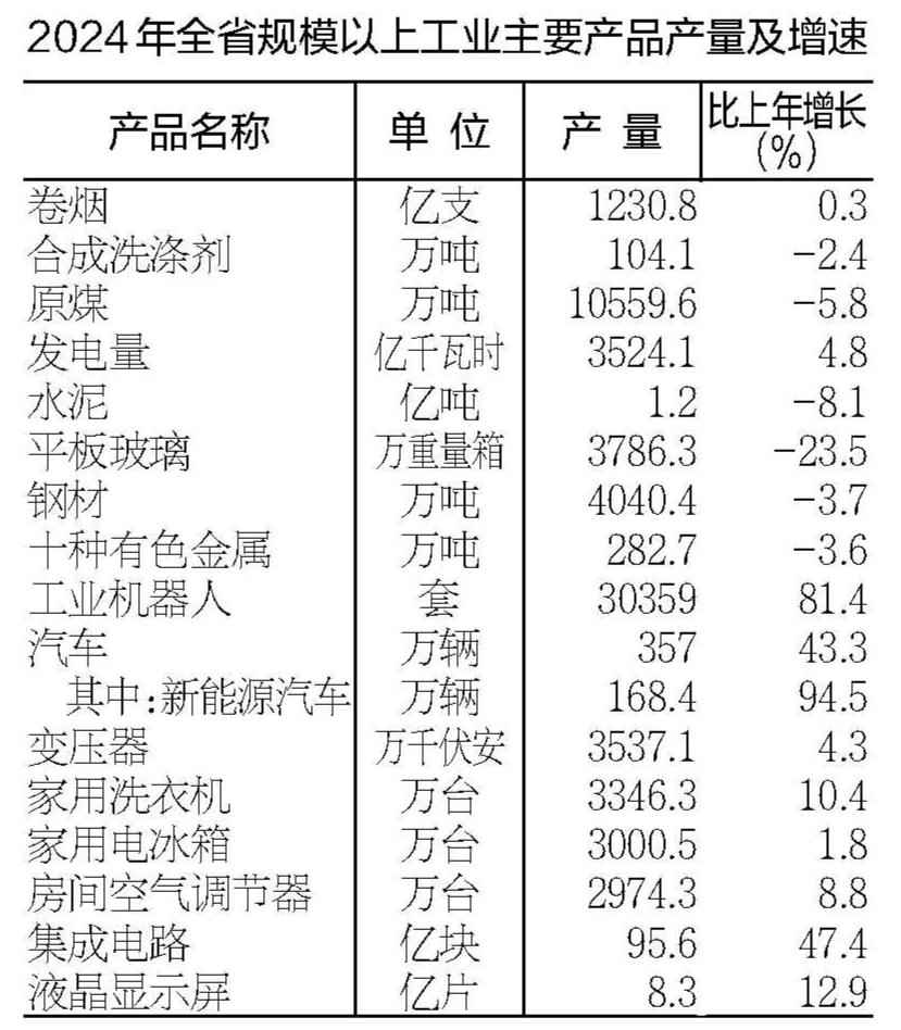 全年规模以上工业增加值比上年增长9.0%。分经济类型看,国有控股企业增加值增长3.6%;股份制企业增长9.0%;外商及港澳台商投资企业增长9.4%。分门类看,采矿业增加值下降1.5%,制造业增长10.3%,电力、热力、燃气及水生产和供应业增长6.9%。分行业看,41个工业大类行业中有35个行业增加值保持增长。其中,计算机、通信和其他电子设备制造业增长26.1%,汽车制造业增长26.7%,通用设备制造业增长10.1%,电气机械和器材制造业增长8.9%,化学原料和化学制品制造业增长8.9%。工业产品中,集成电路和液晶显示屏产量分别增长47.4%和12.9%,汽车产量增长43.3%、其中新能源汽车增长94.5%。