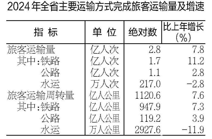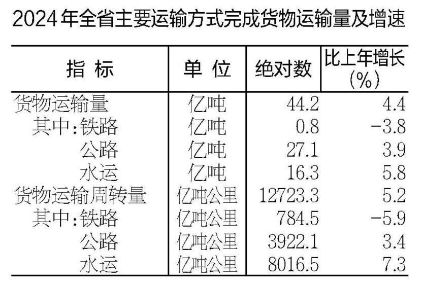 全年货物运输量44.2亿吨,比上年增长4.4%。货物运输周转量12723.3亿吨公里,增长5.2%。港口货物吞吐量6.9亿吨,增长3.4%。旅客运输量2.8亿人次,增长7.8%。旅客运输周转量1120.6亿人公里,增长7.6%。全省民航机场旅客吞吐量1591.5万人次,增长6.9%,其中合肥新桥机场旅客吞吐量1248.1万人次,增长11.7%。