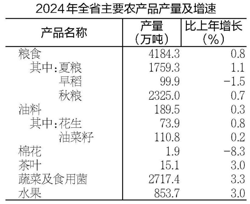 全年粮食种植面积11017.3万亩,比上年增加15.6万亩。油料种植面积998.1万亩,增加32.9万亩。全年粮食产量4184.3万吨,比上年增产0.8%。其中,夏粮1759.3万吨,增产1.1%;早稻99.9万吨,减产1.5%;秋粮2325.0万吨,增产0.7%。油料产量189.5万吨,增产0.3%。