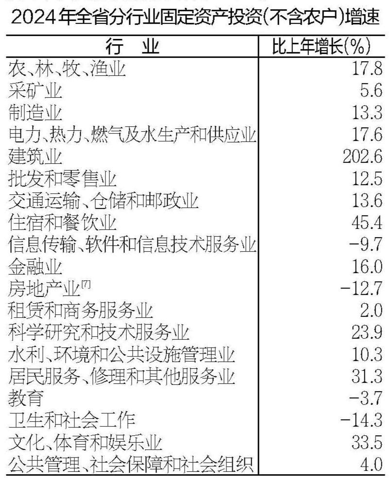 全年固定资产投资(不含农户)比上年增长4.7%,扣除房地产开发投资,固定资产投资增长11.2%。分产业看,第一产业投资增长20.4%,第二产业投资增长13.6%,第三产业投资下降1.4%。工业投资增长13.6%,其中工业技术改造投资增长20.5%。基础设施投资增长11.1%。高技术产业投资增长8.8%。民间投资增长1.7%,其中民间制造业投资增长11.7%。