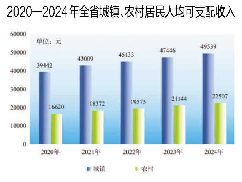 按常住地分,城镇居民人均可支配收入49539元,增长4.4%,扣除价格因素实际增长3.9%;人均消费支出29323元,增长5.1%。城镇居民恩格尔系数为32.7%。农村居民人均可支配收入22507元,增长6.4%,扣除价格因素实际增长5.8%;人均消费支出20154元,增长6.6%。农村居民恩格尔系数为35.3%。