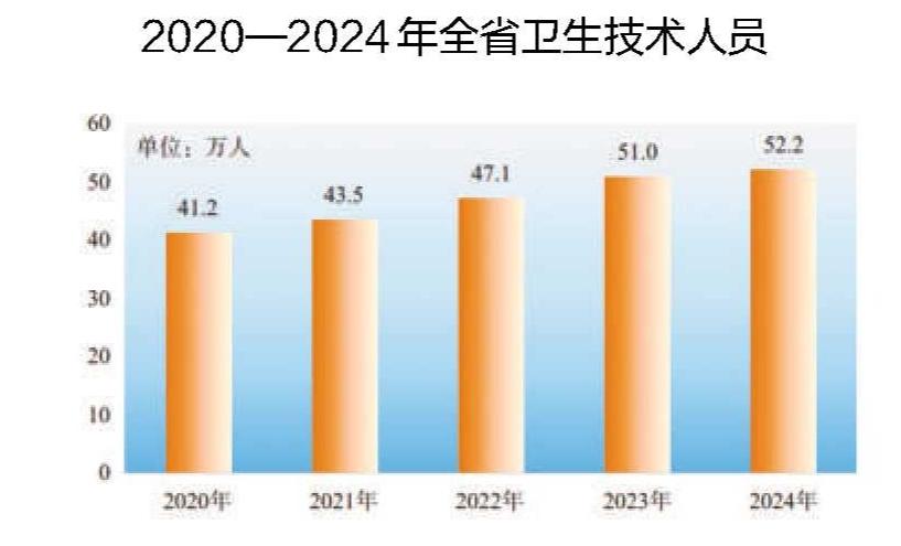 年末全省有医疗卫生机构[14]32600个,其中医院1355个、基层医疗卫生机构30555个、专业公共卫生机构492个、其他卫生机构198个。基层医疗卫生机构中,卫生院1309个,社区卫生服务中心(站)1826个,村卫生室15555个;专业公共卫生机构中,疾病预防控制中心128个,专科疾病防治院(所、站)57个,妇幼保健院(所、站)129个,卫生监督所(中心)94个。年末卫生技术人员52.2万人,其中执业(助理)医师21.0万人,注册护士24.6万人。乡村医生和卫生员2.0万人。医疗卫生机构床位44.8万张,其中医院34.5万张,基层医疗卫生机构床位8.9万张。全年医疗卫生机构共诊疗4.0亿人次。