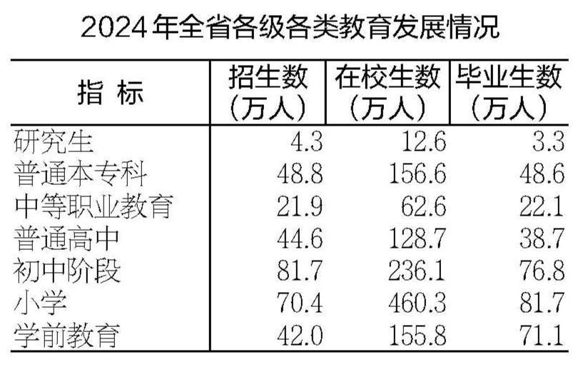 年末全省有研究生培养单位21个,普通高校(含独立学院)125所,各类中等职业教育学校(不含技工学校)232所,普通高中683所,初中2727所,小学5739所,幼儿园10363所。初中阶段适龄人口入学率100%。小学学龄儿童入学率100%。九年义务教育巩固率98.7%。