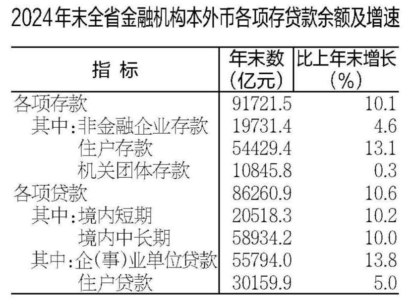 全年全省社会融资规模增量11827.1亿元,比上年减少2060.3亿元。年末社会融资规模存量120141.4亿元,比上年末增长10.4%。年末金融机构本外币各项存款余额91721.5亿元,比上年末增加8418.0亿元,增长10.1%;本外币各项贷款余额86260.9亿元,增加8270.5亿元,增长10.6%。