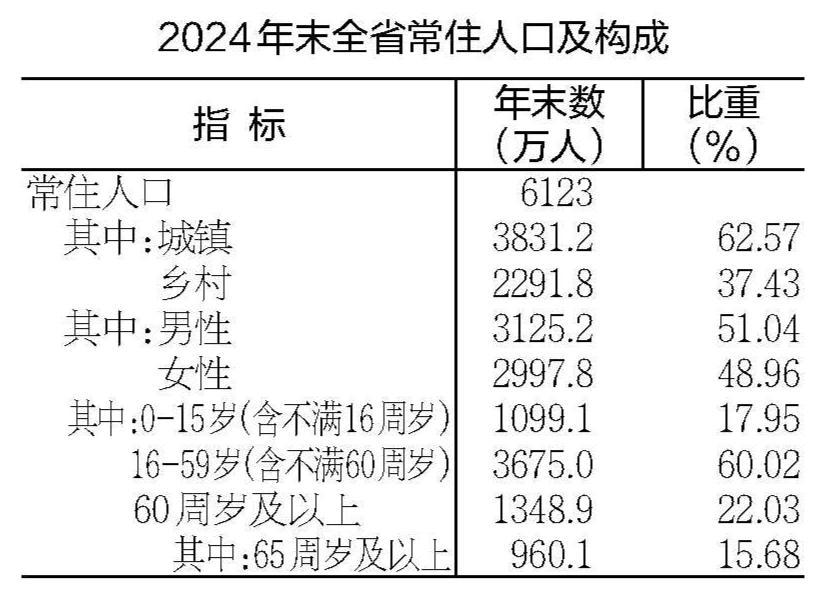 年末全省常住人口6123万人,比上年末增加2万人。全年出生人口37.8万人,出生率为6.17‰;死亡人口51.5万人,死亡率为8.41‰。常住人口城镇化率为62.57%,提高1.06个百分点。