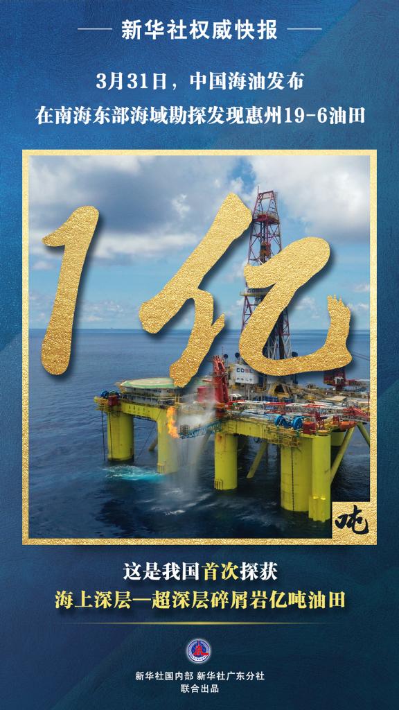 新华社深圳3月31日电(记者 印朋)3月31日,中国海油发布消息,我国在南海东部海域勘探发现惠州19-6亿吨级油田。这是我国首次探获海上深层—超深层碎屑岩大型整装油田,展示出我国近海深层—超深层领域油气勘探潜力。