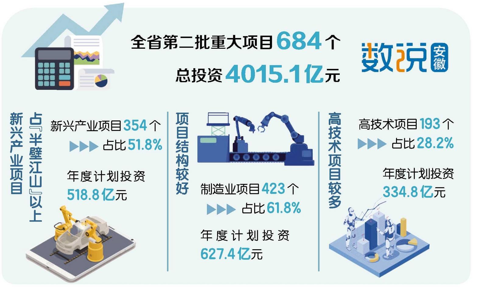 4月2日,2025年全省第二批重大项目开工动员会在合肥举行。记者了解到,全省第二批开工动员重大项目684个,同比增加269个;总投资4015.1亿元,同比增加806.7亿元;年度计划投资1025亿元,同比增加272.9亿元。