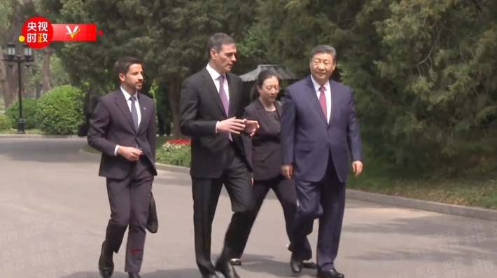 四月的北京,春意盎然,生机勃勃。会见后,习近平主席同西班牙首相桑切斯一起散步。