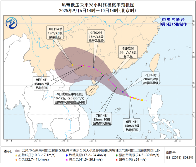 南海热带低压于9月5日晚上在南海中东部海面生成,6日14时其中心位于广东省茂名市电白区东偏南约700公里的海面上,中心附近最大风力有7级(15米/秒)。预计该低压中心将以每小时10~15公里的速度向西偏北方向移动,即将加强为今年第16号台风,之后趋向广东中西部沿海,并将于8日凌晨至中午在上述沿海登陆(强热带风暴级或台风级,28~33米/秒,10~12级),登陆后强度逐渐减弱。