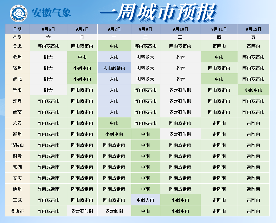 9日(周二):淮北地区北部阴天转多云;淮北地区南部和淮河以南阴天有阵雨或雷雨,部分地区中雨,局部大雨。